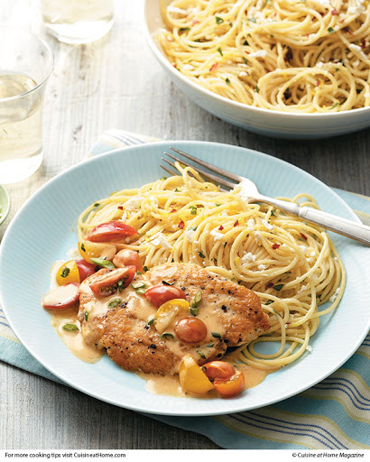 Off heat, deglaze pan with vodka and cook until liquid evaporates. Add broth and cream and reduce until thick, 2–3 minutes. Stir in tomatoes and lemon juice and bring to a simmer. Return cutlets to pan and cook to warm through, 1 minute per side.