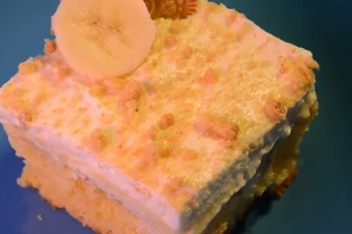 Pour pudding over cake. Taking care to get it into the holes as much as possible.