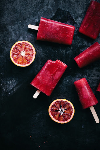 Juice the blood oranges (approximately 400 ml juice). Let sugar and water come to a boil in a sauce pan, let simmer for a minute. Mix 100 ml of the syrup with the blood orange juice. Add vodka and stir. Pour into six popsicle molds and put in the freezer. Let stand 60-90 minutes, then push down a popsicle stick into each ice cream. Freeze for another 3-4 hours.