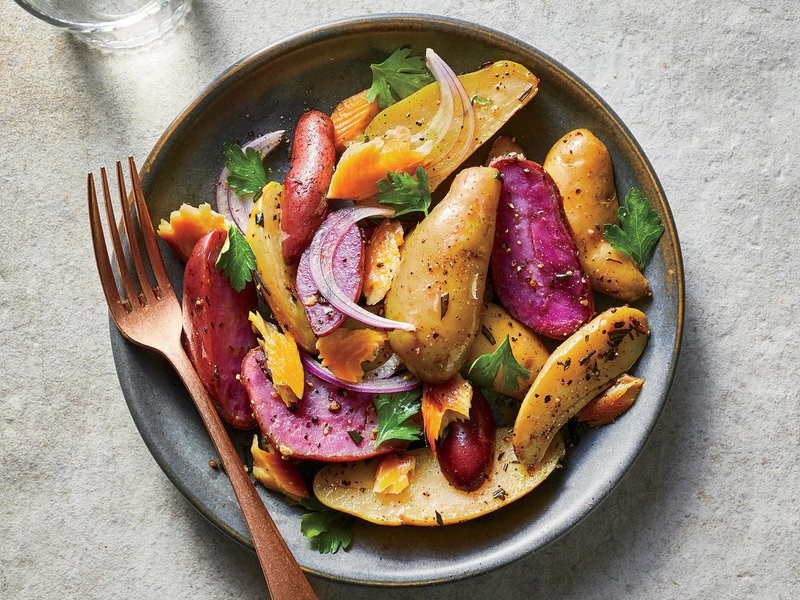 2. Combine potatoes, thinly sliced red onion, fresh flat-leaf parsley leaves, olive oil, chopped fresh rosemary, black pepper, and kosher salt in a bowl.