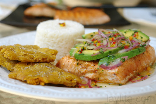 Serve the salmon topped with the avocado salsa, and with rice and patacones or thick green plantain chips on the side.
