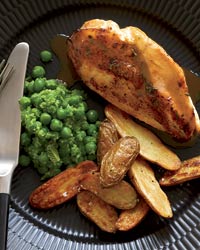 Transfer the chicken breasts and potatoes to plates. Spoon the mashed peas alongside and serve with the pan sauce.