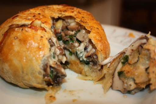 **Notes:** If you want to omit the portobello mushroom then just fill each square with equal parts crimini mushroom/spinach and Gruyere filling. Brush the egg wash on the outer parameters of the puff pastry and fold opposite corners together to make a triangle pocket. Bake as directed and serve with a green salad.