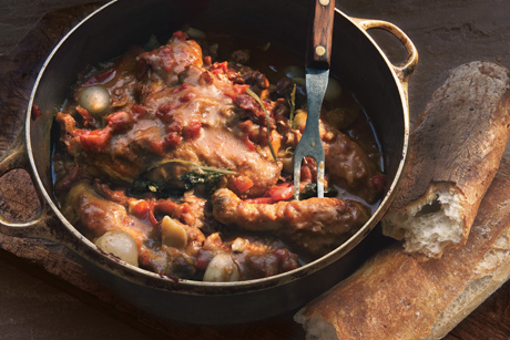 Braise chicken until very tender, about 1 1/2 hours. Discard bay leaves and parsley. Using tongs, transfer chicken and toppings to platter. Return sauce in pot to simmer. If thicker sauce is desired, stir 1 tablespoon flour and butter in small bowl until smooth paste forms. Add flour paste to sauce and whisk to blend. Simmer until sauce thickens to desired consistency, whisking often. Season sauce to taste with salt and pepper. Spoon over chicken and serve.