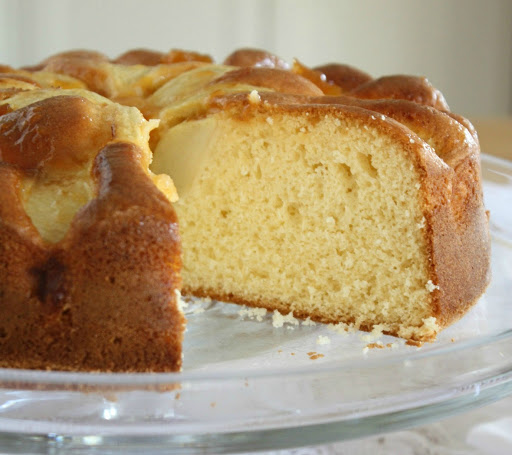Mix flour and baking powder and fold into the mixture until just combined. Pour into pan. Add apples pressing them gently into the batter.