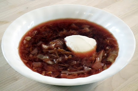 Peel then shred beets and carrots, chop onion, simmer, covered with 2 2/3 cups boiling salted water and beef broth for 20 minutes. Add cabbage and butter, simmer uncovered for 15 minutes. Stir in lemon juice. Serve hot or chilled with a tablespoon of sour cream in each bowl.