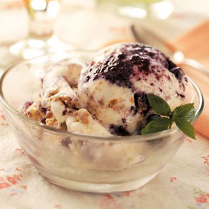 In a large container, layer the ice cream, waffle cones and blueberry sauce three times; swirl.