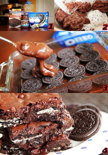 4.Pour half of the brownie batter into the baking dish, layer with Oreos, then top with remaining batter. Bake for 40-50 minutes or as directed on the back of the box.