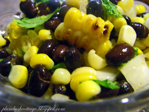Brush the corn with olive oil and grill until done, turning often. Set aside to cool a bit. Standing corn on end, slice off the kernels.