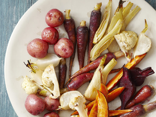 Choose several vegetables and make a foil packet for each: Pile the vegetables on foil, sprinkle with salt and drizzle with 1 tablespoon olive oil and 2 tablespoons water. Seal into a packet, put on a baking sheet and roast at 450 degrees F until tender. Keep sealed until ready to serve.