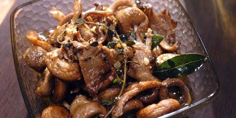 2. Heat the oil, garlic, lemon juice and zest with the bay leaves, thyme and pepperoncini. Cook 5 minutes, pour over the mushrooms, and let cool in the marinade. Cover and refrigerate overnight, turning once.