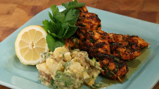Grill the chicken skewers over a high heat, turning frequently so that the flames don’t burn the delicate meat. Serve with a squeeze of lemon and potato salad.