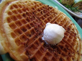 In a medium bowl, beat the egg. Add the milk, sour cream and melted butter. Add the baking mix and mix well. Fold in the cooked and crumbled bacon strips and the Cheddar cheese. Spoon batter onto a prepared, hot waffle iron. Close waffle iron and cook until golden brown, according to the waffle makers instructions. Serve drizzled with maple syrup or your favorite fruit-flavored syrup.