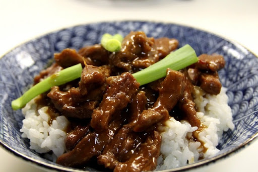•After a few minutes, use a large slotted spoon to take the meat out and onto paper towels, then pour most of the oil out of the skillet. Put the pan back over the heat, dump the meat back into it and stir-fry for 1 minute. Add the sauce, cook for 1 minute while stirring and add green onions. Cook for 1 more minute. Now at this point you can either remove the beef with a slotted spoon or tongs and discard the sauce (this is what P.F. Chang's does) OR thicken the sauce with a cornstarch-water mixture to desired thickness and serve it over rice with the beef