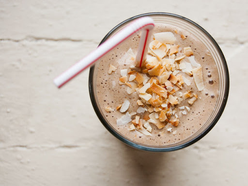 Add chilled coffee, hazelnuts, milk, banana, and agave nectar to blender and blend on high until completely smooth, about 1 minute. Add ice and blend on high until smooth, about 30 seconds longer. Transfer to one or two glasses, sprinkle with coconut and serve immediately.