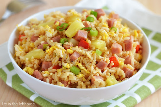 Push the rice to one side of the skillet. Crack the eggs onto the other side of skillet and stir until lightly scrambled and set. Stir the eggs and the ham mixture into the rice. Pour the soy sauce mixture into the rice and cook, stirring until combined and hot.