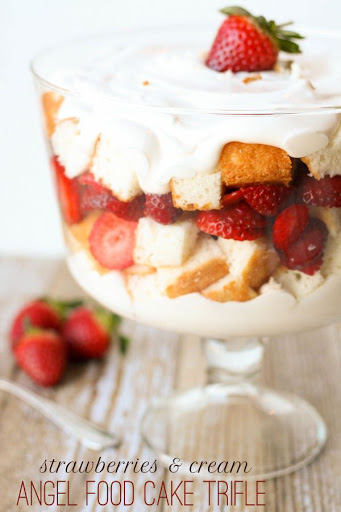 4.Make the trifle by adding 1/2 cream mixture to the bottom. Then add your angel food cake squares. Then add your strawberry slices. Top off with the other half of the cream mixture and then a strawberry on top.