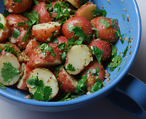 Quarter potatoes an boil them for 10 minutes until tender and let cool. Add all other ingredients together and blend together. Add potatoes.
