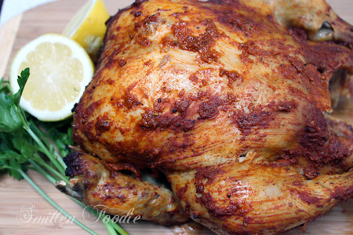 Combine all ingredients together in a small bowl and add water by the teaspoon until a paste forms. Stir until well combined. Place foil balls in bottom of crockpot and lightly spray inside of crockpot with cooking spray. Rub entire chicken with spice rub and place in the crockpot, on top of the foil balls. Cover and cook on low for 6-7 hours or on high for 3 1/2 – 4 1/2 hours.