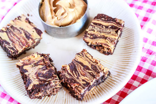 Pour batter into prepared baking dish. Microwave peanut butter for about 30 seconds. Drop melted peanut butter by spoonfuls onto the batter, swirling gently with a knife to create a marbled effect. (Try not to overmix!)