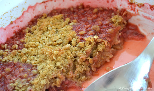 In an oven proof dish, combine your strawberries, rhubarb, sugar, and water/or juice.