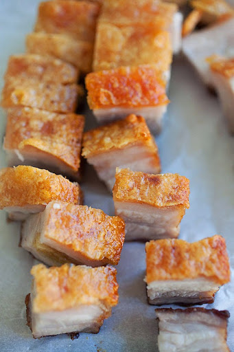 - 1 lb pork belly 6 cloves garlic 1 teaspoon five spice powder 1 cup salt - See more at: http://www.kusinamaster.net/2014/05/chinese-roast-pork.html#sthash.i8cKmKoH.dpuf