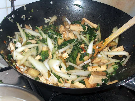 Add cooked tofu and eggplant to pan with ginger mix. Add bok choy and water chestnuts. Cook and stir for about one more minute until bok choy turns bright green.
