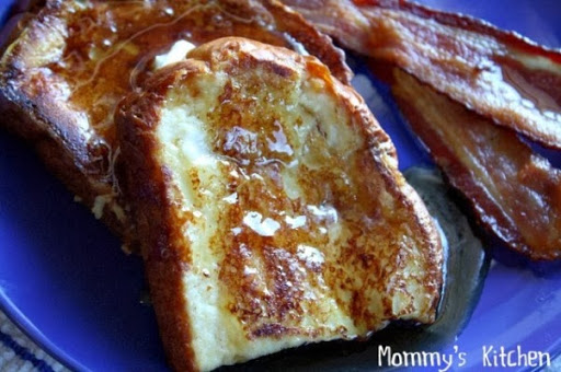 Place bread on pan, stirring batter between dipping. Turn with spatula when golden brown. Serve with butter and powdered sugar or use syrup.
