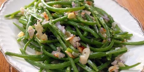 1. Blanch the beans in salted water, drain and refresh in ice cold water. Drain well. If the beans are particularly large, tear them down the middle into “shoestrings”. Toss with the almonds, shallots, and oil. Season with salt and pepper.