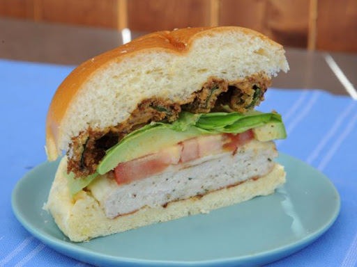 Grill the patties until fully cooked, about 5 minutes per side. Serve on a warmed bun smeared with some Pasilla Aioli. Top each burger with a slice of cheese, a lettuce leaf, tomato slice and some Poblano Rings.
