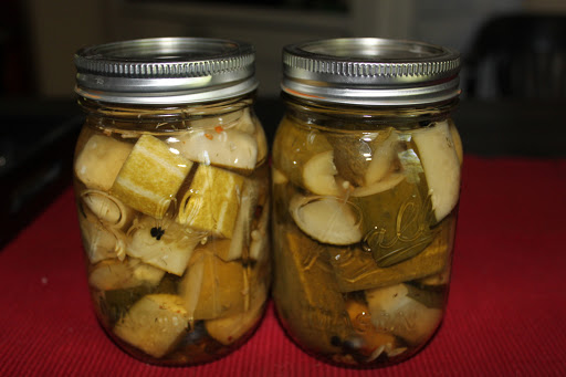 Wash and slice the cucumbers. Pack the slices firmly into the jars, leaving as little space in between them as you can. Pour the brine into the jar, leaving ½ inch headspace.