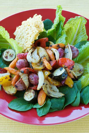 Arrange the salad on a serving plate or platter and top with the roasted vegetables and serve immediately.