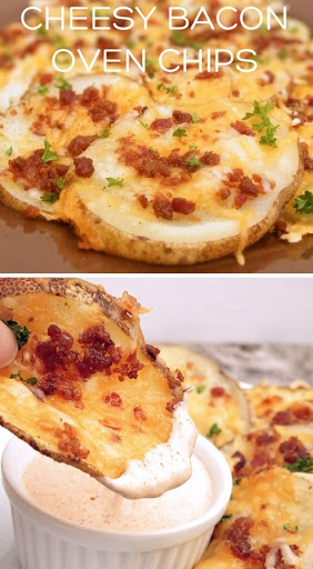 3. Grease a baking sheet with cooking spray, and lay out potato slices so they are overlapping on it. Spray lightly with additional cooking spray, then sprinkle with salt & pepper to taste. Sprinkle evenly with shredded cheese & bacon.