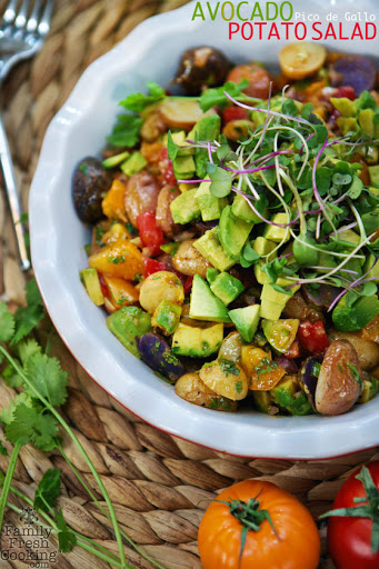 In a large bowl place the cooled potatoes with all the pico de gallo ingredients, gently folding in cilantro and 1 chopped avocado last. Adjust seasonings to taste & add some jalapeño if you want some spice. Top potato salad with the additional chopped avocado & micro greens