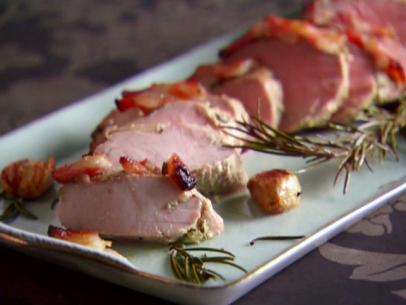 Place the roasting pan in the oven and bake for 25 to 30 minutes or until an instant-read thermometer, inserted in the tenderloins, registers 160 degrees F. Remove from oven when desired doneness is reached and let sit for 5 to 10 minutes on a cutting board. Remove kitchen twine, slice and serve with your favorite sides. Garnish with the rosemary sprigs and garlic.