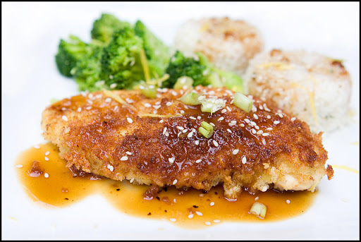 Make this Asian-inspired fried chicken recipe your next family dinner. Wasabi panko breaded chicken breasts are pan fried and topped with teriyaki sake pan sauce.