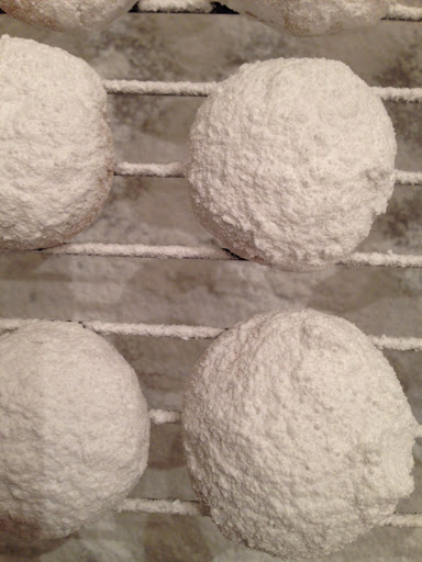 5.Put the remaining 1 cup of confectioner's sugar in a large shallow bowl. Let ccokies cool 5 minuteson the baking sheets, then carefully transfer to the bowl with the sugar and gently toss. Transfer to racks completely, then toss in sugar again