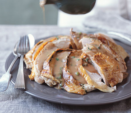 - 1 14- to 16-pound turkey, rinsed, patted dry inside and out; neck, heart, and gizzard reserved for Shortcut Turkey Stock