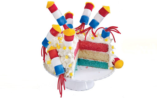 Trim tops of cakes with a serrated knife to make level. Place blue layer on a platter and spread top with ½ cup frosting. Then place white layer on top and spread with another ½ cup frosting. Finish with red layer, trimmed side down. Smooth a thin layer of remaining frosting over entire cake; freeze 30 minutes.