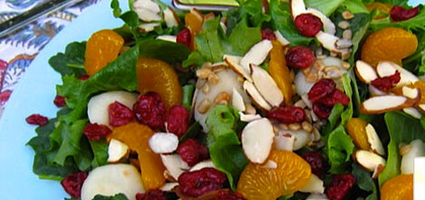 Mix all vinaigrette ingredients in jar and shake. Can store in fridge for 3 weeks. Mix all salad ingredients and stir in half the vinaigrette or as desired. Serves 6 side salads.