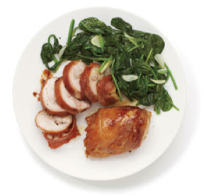 Meanwhile, heat the remaining tablespoon of oil in a large skillet over medium heat. Add the sliced garlic and cook, stirring, until fragrant, 1 to 2 minutes. Add the spinach and ¼ teaspoon each salt and pepper and cook, tossing, until the spinach begins to wilt, 1 to 2 minutes more. Serve with the chicken.