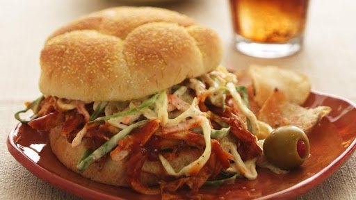 3. Place about 1 cup chicken mixture on bottom of each roll and top with about 1/2 cup coleslaw and bun top.