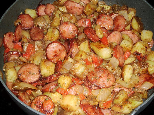 In a large skillet heat oil...add in the smoked sausage and cook, turning often till browned on edges. Remove meat from skillet and add in the potatoes and cook over med. high heat till they begin to brown and become tender. Add in the onions, pepper and garlic cooking for about 5 minutes then add in the chicken stock and cover. Cook for about 5-6 minutes, stirring occasionally. Remove cover and check potatoes for doneness. Add the spices, stir and add in the smoked sausage. Combine all ingredients and serve. This recipe serves 4 people.