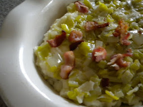 In a medium sauce pan with a lid, melt the bacon fat, add the leeks, water and salt and cook covered on medium low heat for 20 to 25 minutes stirring frequently. Remove the lid and cook a few more minutes until most of any liquid has evaporated. Set aside.
