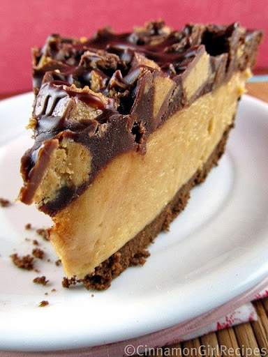 Carefully pour over the pie (you can leave a few spoonfuls for drizzling over the PB cups) and evenly spread from edge to edge. Sprinkle peanut butter cups evenly over top and gently press them into the chocolate. Drizzle lightly all over with remaining chocolate.