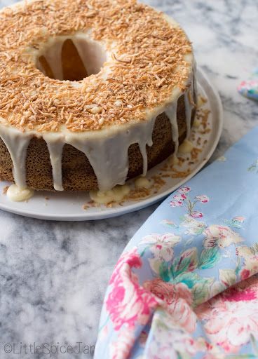 Place a rack in the center of the oven and preheat the oven to 350 degrees F. Spray a nonstick angel food cake or bundt cake pan with nonstick cooking spray. Drop the ¼ cup of sugar in the pan and move the pan around to distribute the sugar evenly all over the bottom and up the sides. Leave excess sugar inside. Spread the sweetened coconut flakes evenly on the bottom. Set aside.