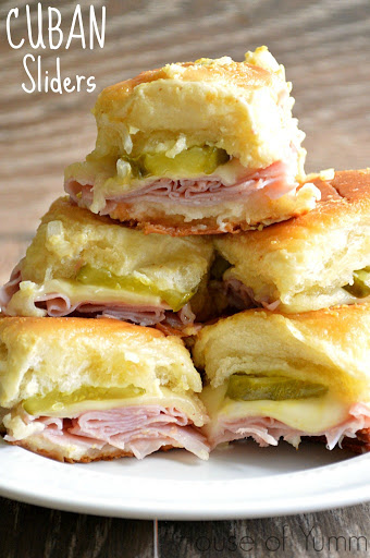 An appetizer version of the classic Cuban sandwich. Dijon spread made with melted butter and minced onion makes this tasty ham and cheese.