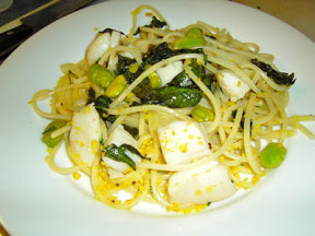 Scallops, RAMPS, AND DANDELIONS GREENS OVER PASTA