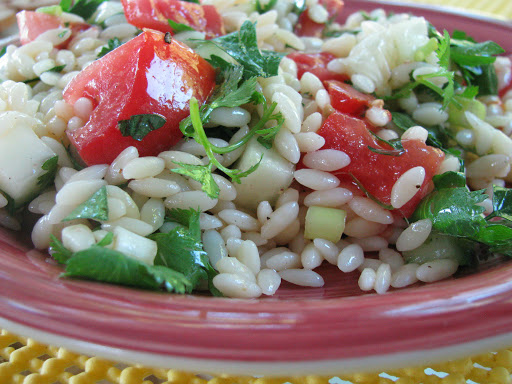 Add tomato, scallions, cucumber, parsley, cilantro, mint and orzo in a serving bowl.