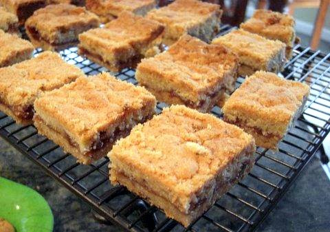 Spoon half the batter into a GREASED 9 inch square pan. Spread evenly, use fingertips. Top with strawberry jam, spread evenly. Cover with remaining dough. Pat to cover. Bake for 1 hour or until golden brown. Cool completely and cut into 2 inch bars.